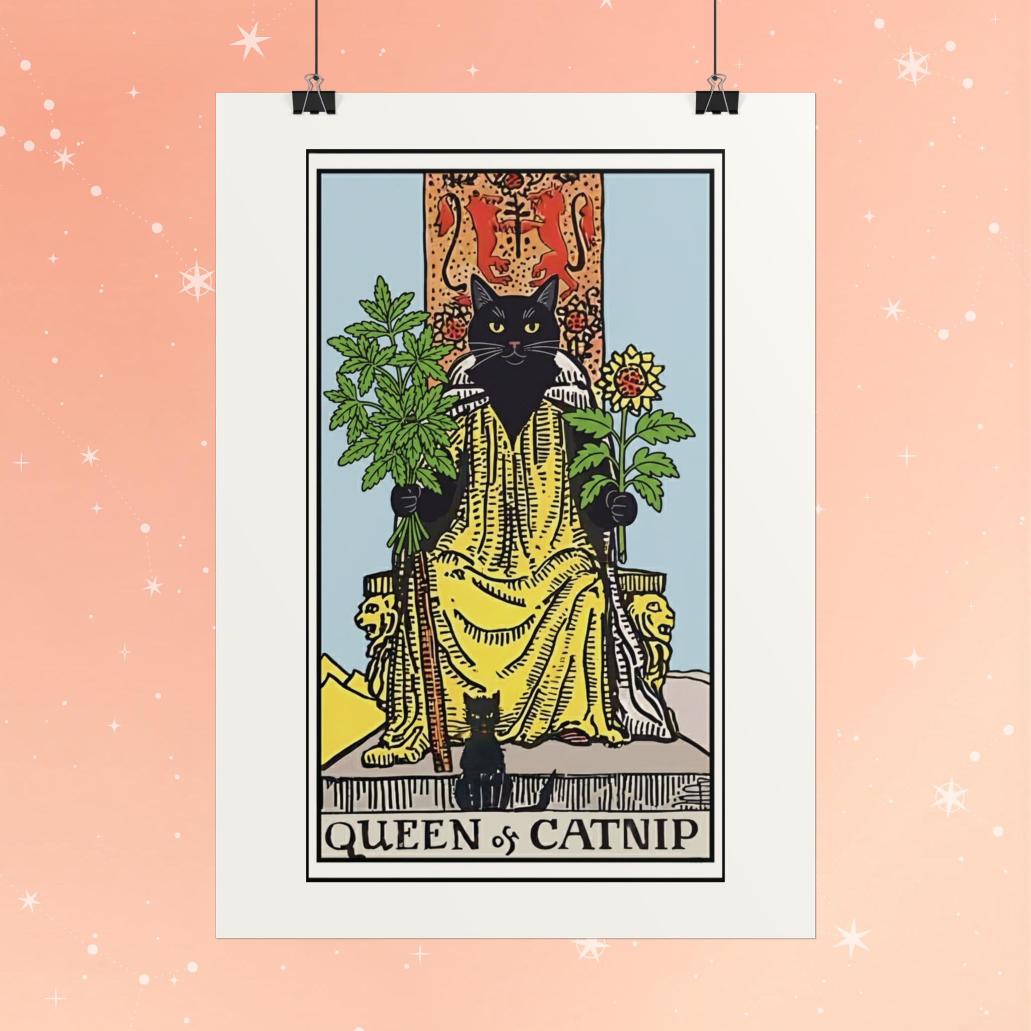 A bold, whimsical art poster that turns tarot imagery into cozy cat magic. Rendered with vivid pigment inks on archival museum-grade paper, the print shows a regal black cat seated like royalty amid leafy catnip and floral accents, labeled “Queen of Catnip.” It hangs beautifully in living rooms, reading nooks, or home offices to add playful mysticism and bright, lasting color. Choose glossy or matte finishes and multiple sizes to suit framed or tape-up display; made for indoor spaces and REACH certified for peace of mind.