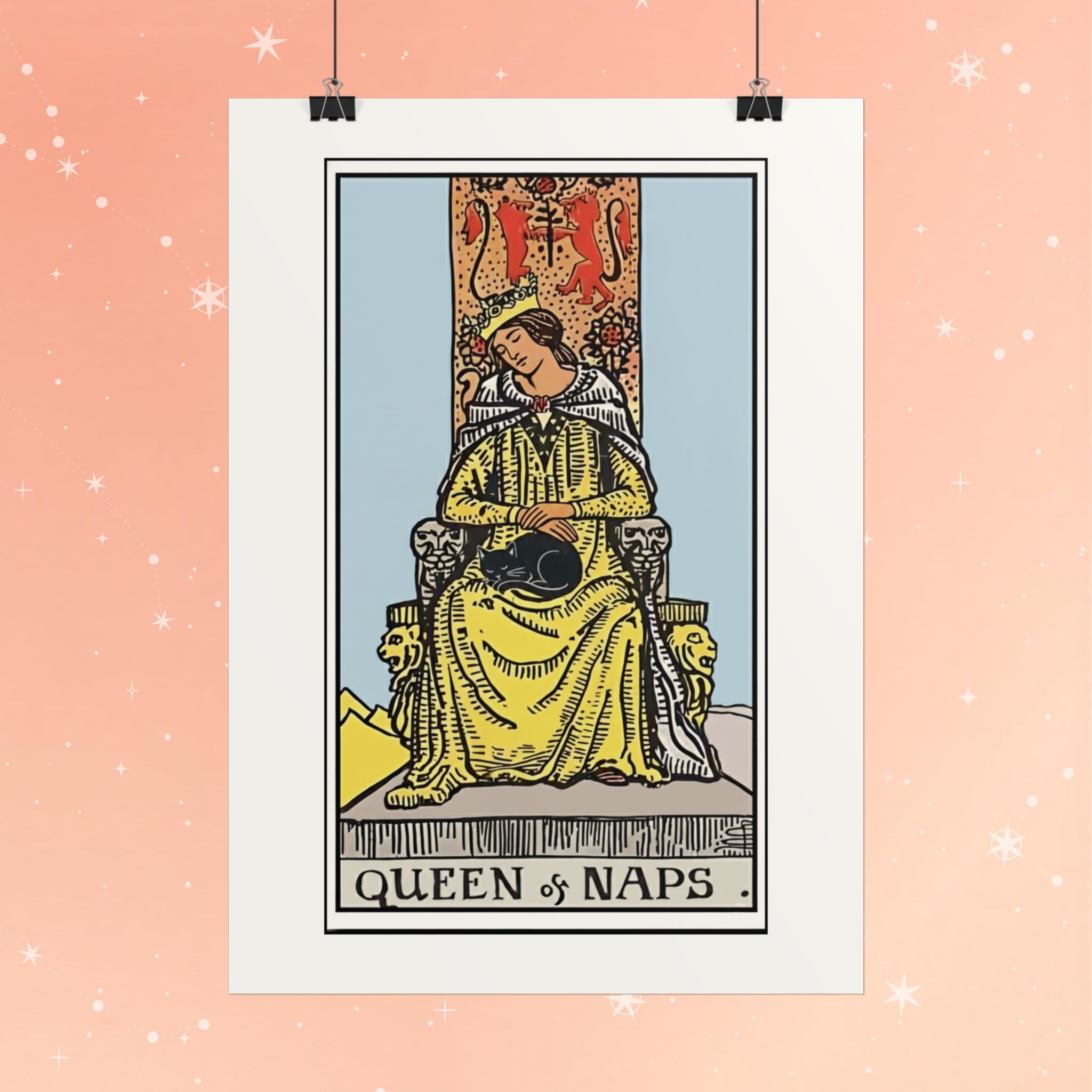 A museum-grade tarot-style poster that brings quiet humor and vintage charm to a cozy wall. This print reproduces an illustrated “Queen of Naps” card in rich, pigment-ink color on archival paper so the soft pastels, warm yellows, and fine linework stay vivid over time. Hang it in a bedroom, reading nook, or home office to nod at restful rituals and slow afternoons — it reads like a little private talisman that invites pause and gentle amusement. Choose glossy or matte finish and from multiple sizes to suit frames or gallery walls; use double-sided tape, tacks, or frame it for a more formal display. REACH-certified and made for indoor use, this poster is made to keep its charm for years.
