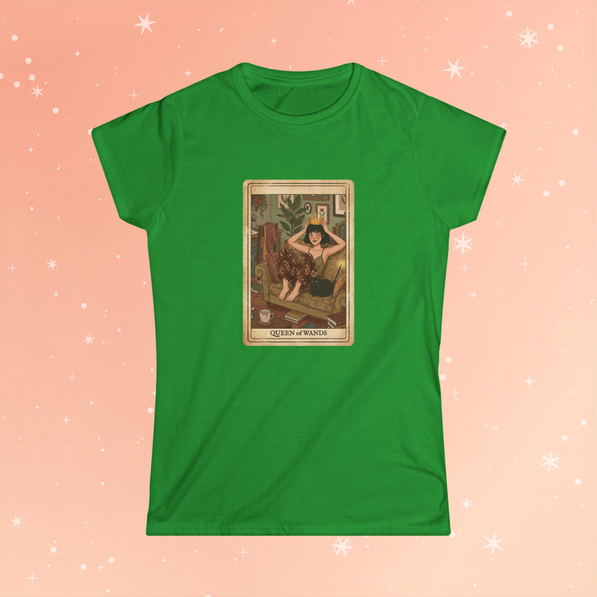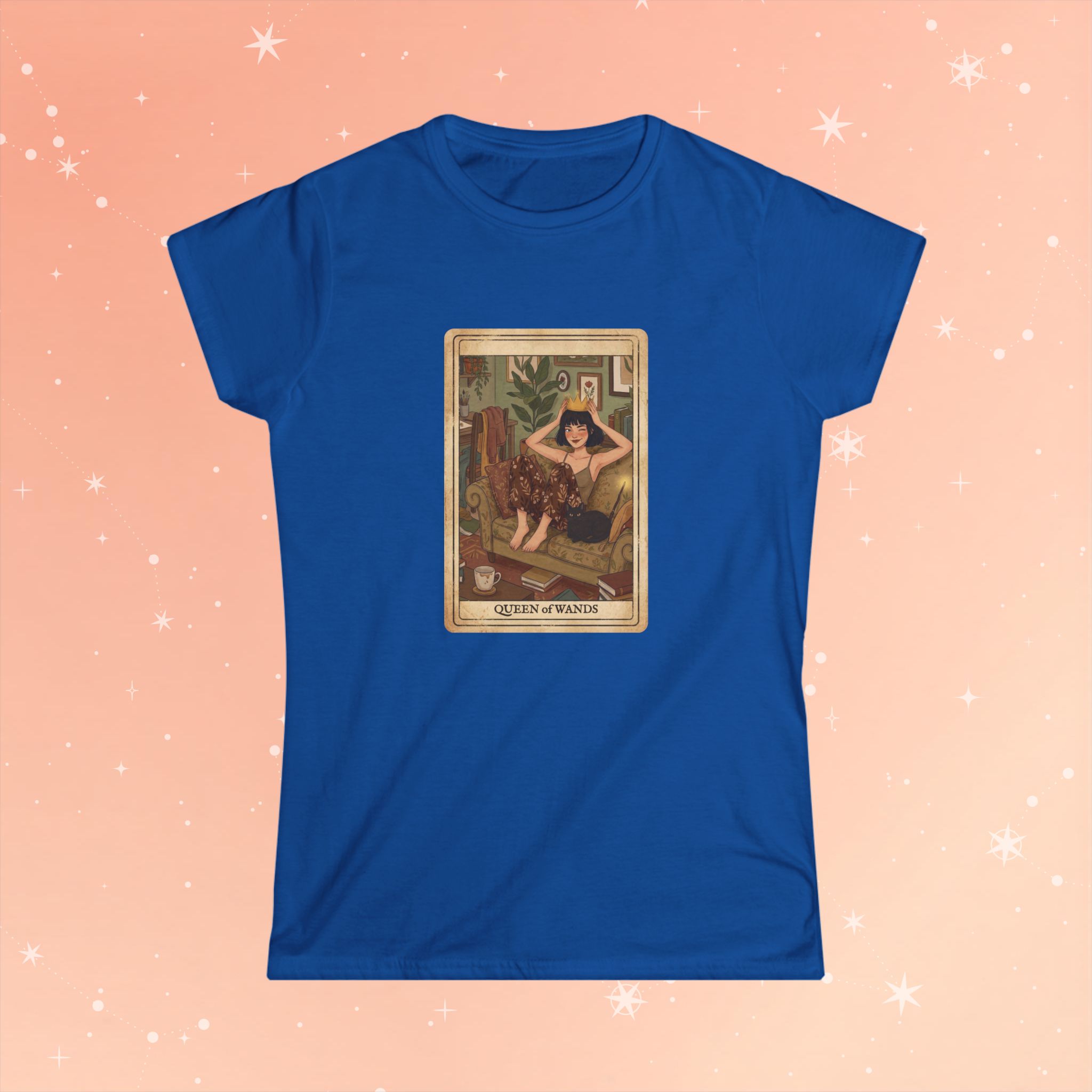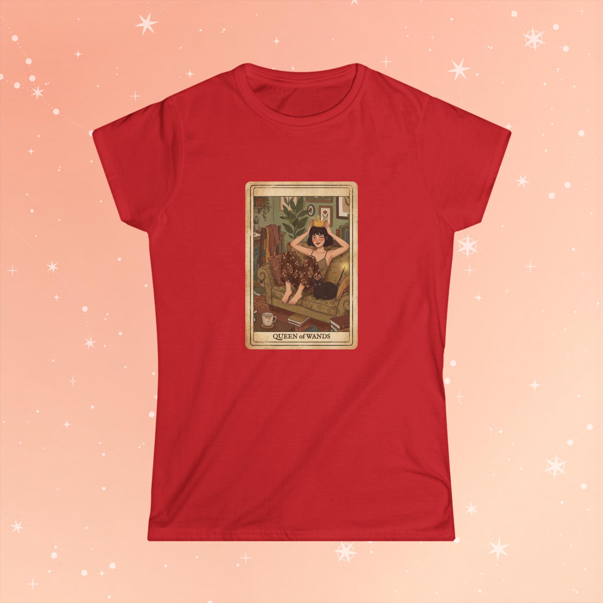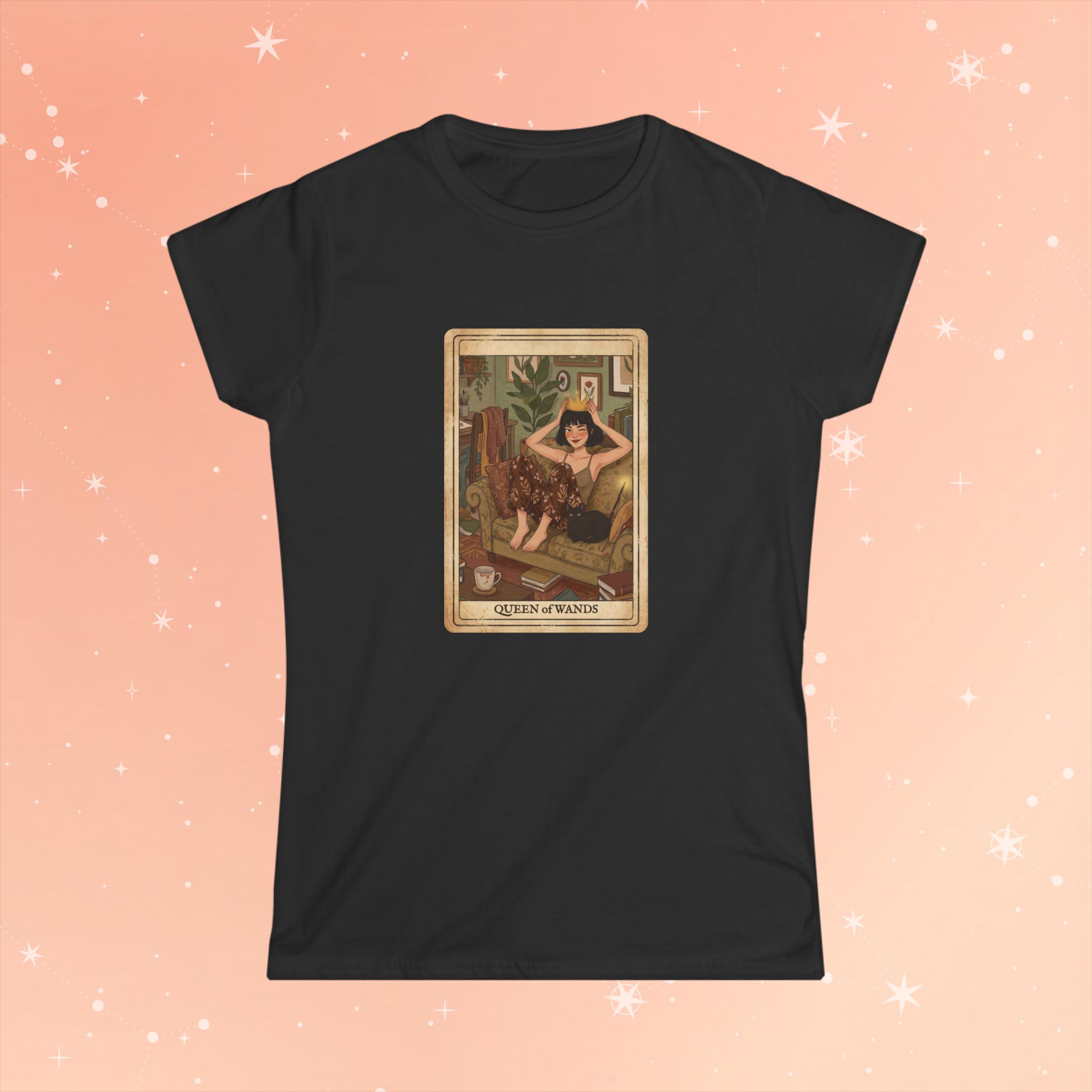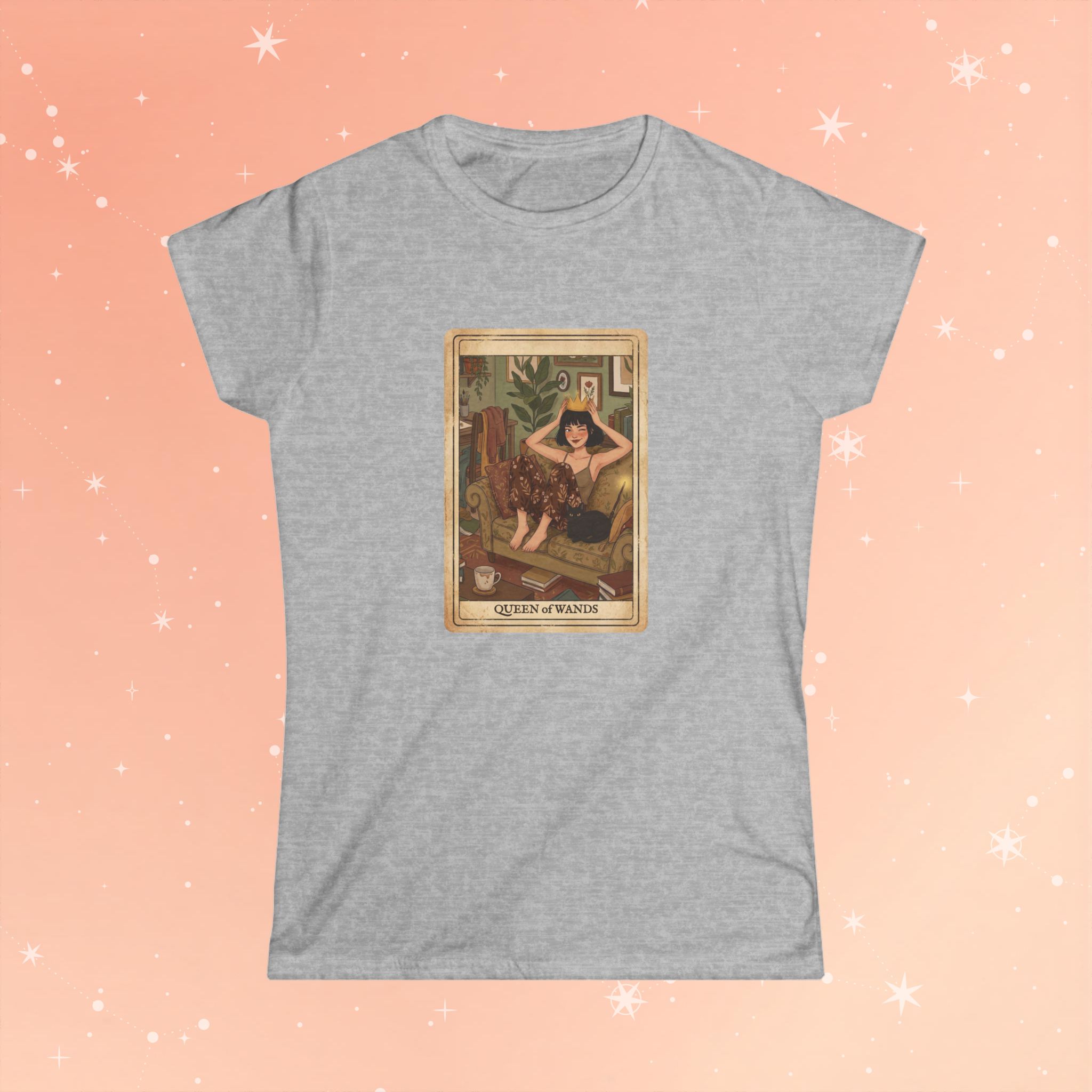 Soft, breathable cotton meets tarot-inspired charm. This lightweight tee wears like a favorite: lightly structured at the shoulders, gently fitted through the waist, and smooth against the skin. The front features a warm, vintage-style Queen of Wands illustration—sunlit tones, cozy interior details, and a confident sitter holding a wand—framed like an old tarot card for an intimate, mystical vibe. It slips easily into everyday wardrobes: layered under a cardigan for slow mornings with coffee, paired with high-waisted jeans for gallery nights, or worn alone while journaling by candlelight. The look speaks to someone who moves between creative ritual and relaxed real life, someone who wants a garment that feels thoughtful and lived-in from the first wear.