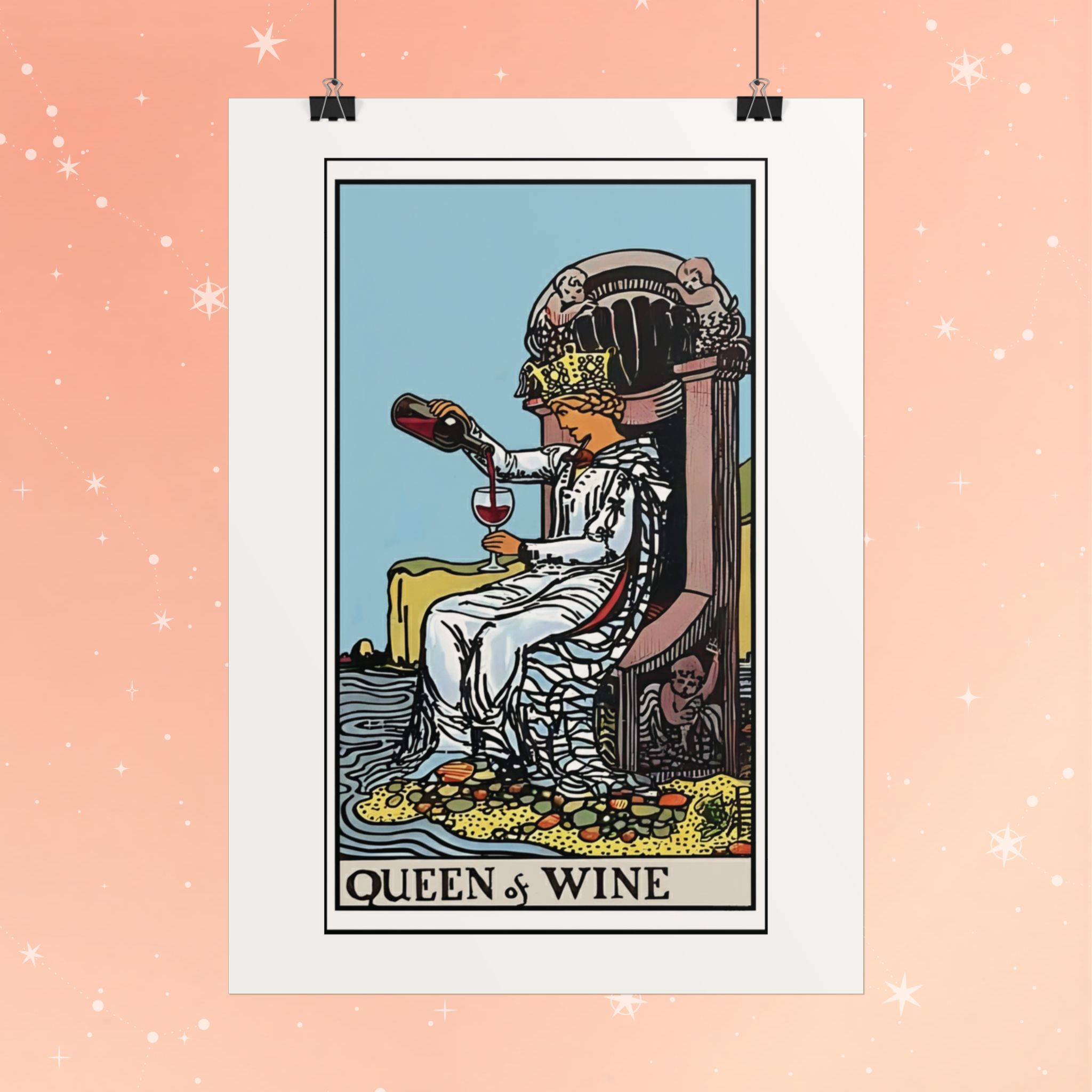 This poster brings a playful, tarot-inspired mood to any indoor space. Printed on archival museum-grade paper with vivid pigment inks, the artwork’s rich blues, warm golds and detailed linework stay crisp for years. The composition—labeled “Queen of Wine”—feels like a wink to evenings spent lingering over a glass, cozy conversations, and rooms that celebrate personality and humor. Hang it framed or with tape above a bar cart, in a kitchen nook, or beside a favorite bookshelf to add a touch of whimsical elegance and sly charm.