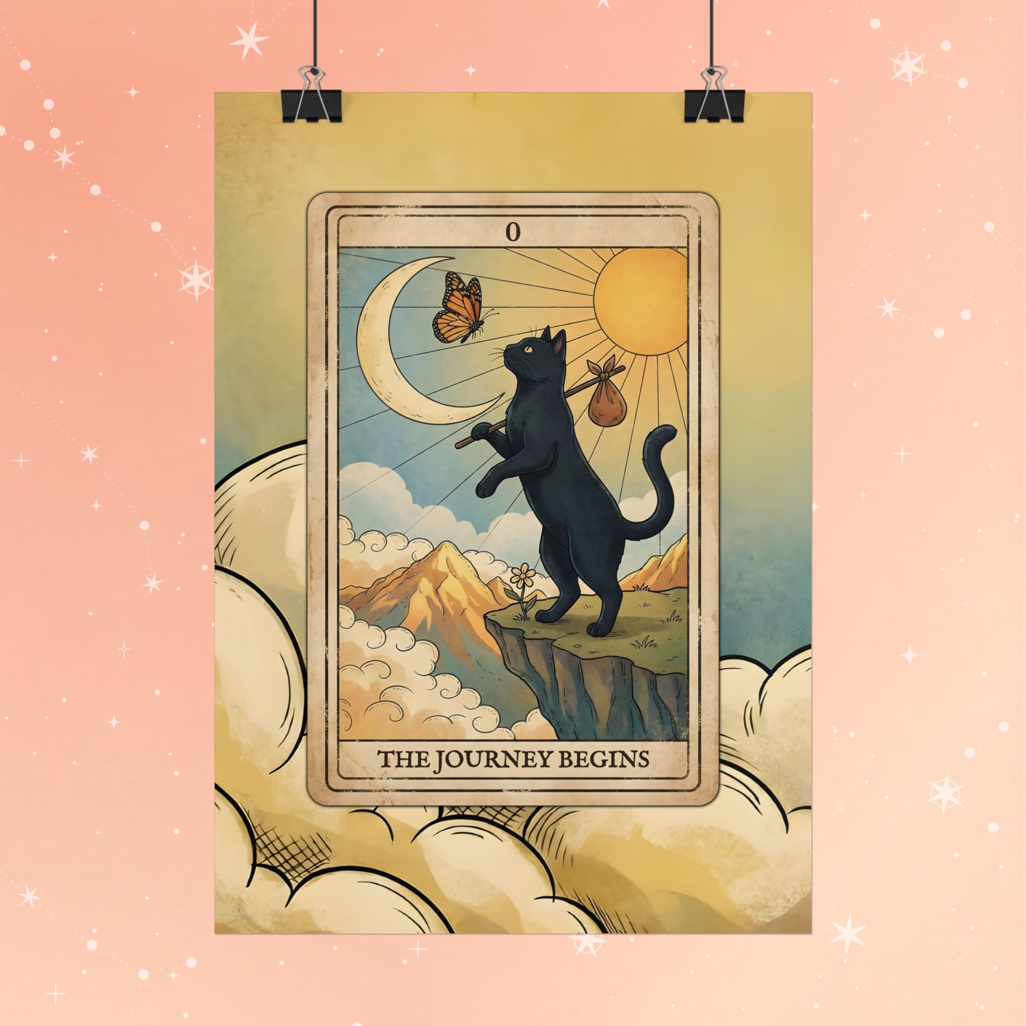 A dreamy tarot-style poster that captures the start of an adventure. A black cat stands on a cliff, paw lifted toward a butterfly between crescent moon and sun — captioned “The Journey Begins.” Warm vintage hues and soft clouded borders create a nostalgic, mystical atmosphere that invites quiet reflection. Printed on museum-grade paper with vivid pigment inks, this print keeps its color and detail for years. Hang it unframed with clips or tape, or frame it to anchor a reading corner, bedroom, or studio. It’s sized for a range of indoor spaces and available in glossy or matte finishes to suit your wall’s mood.